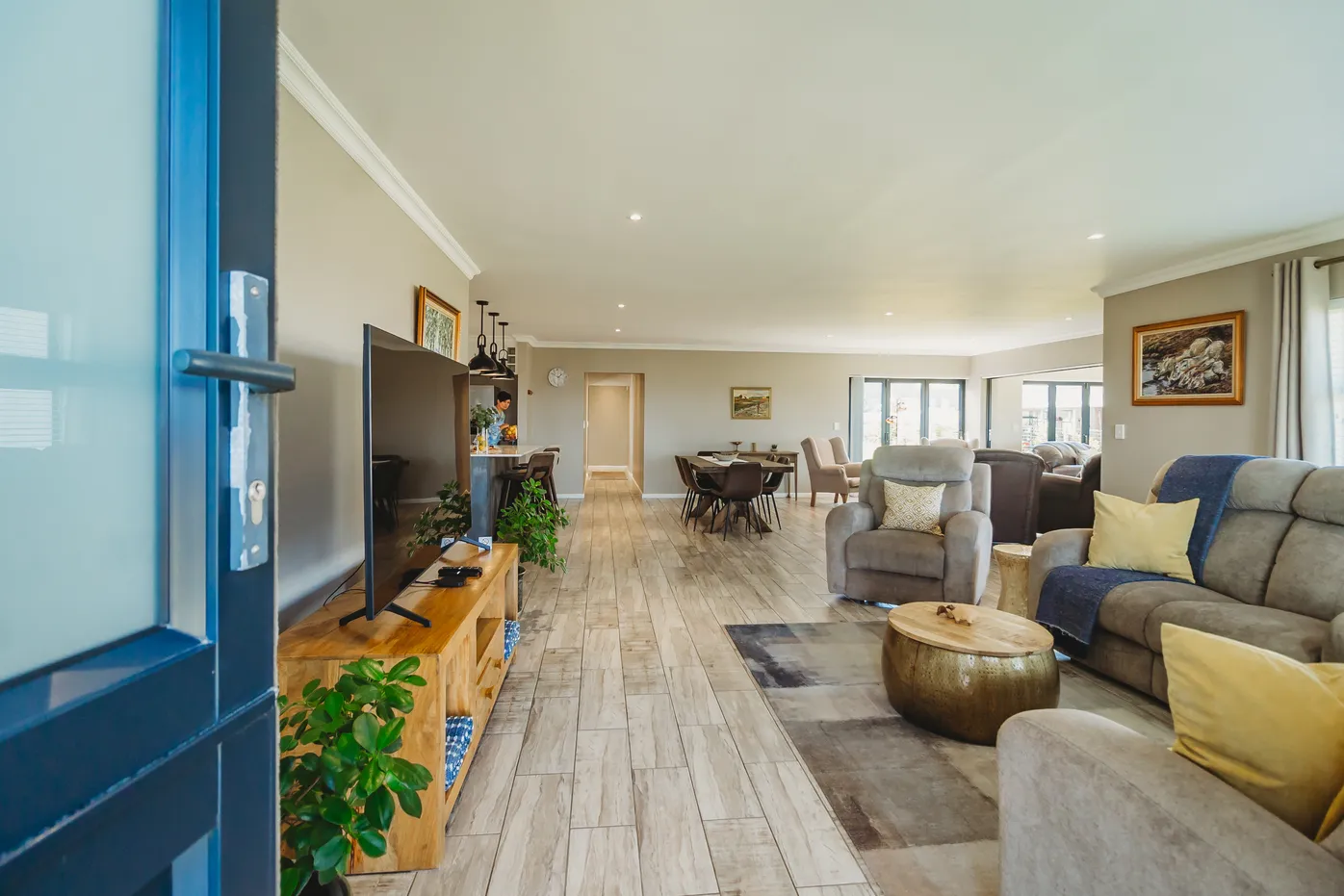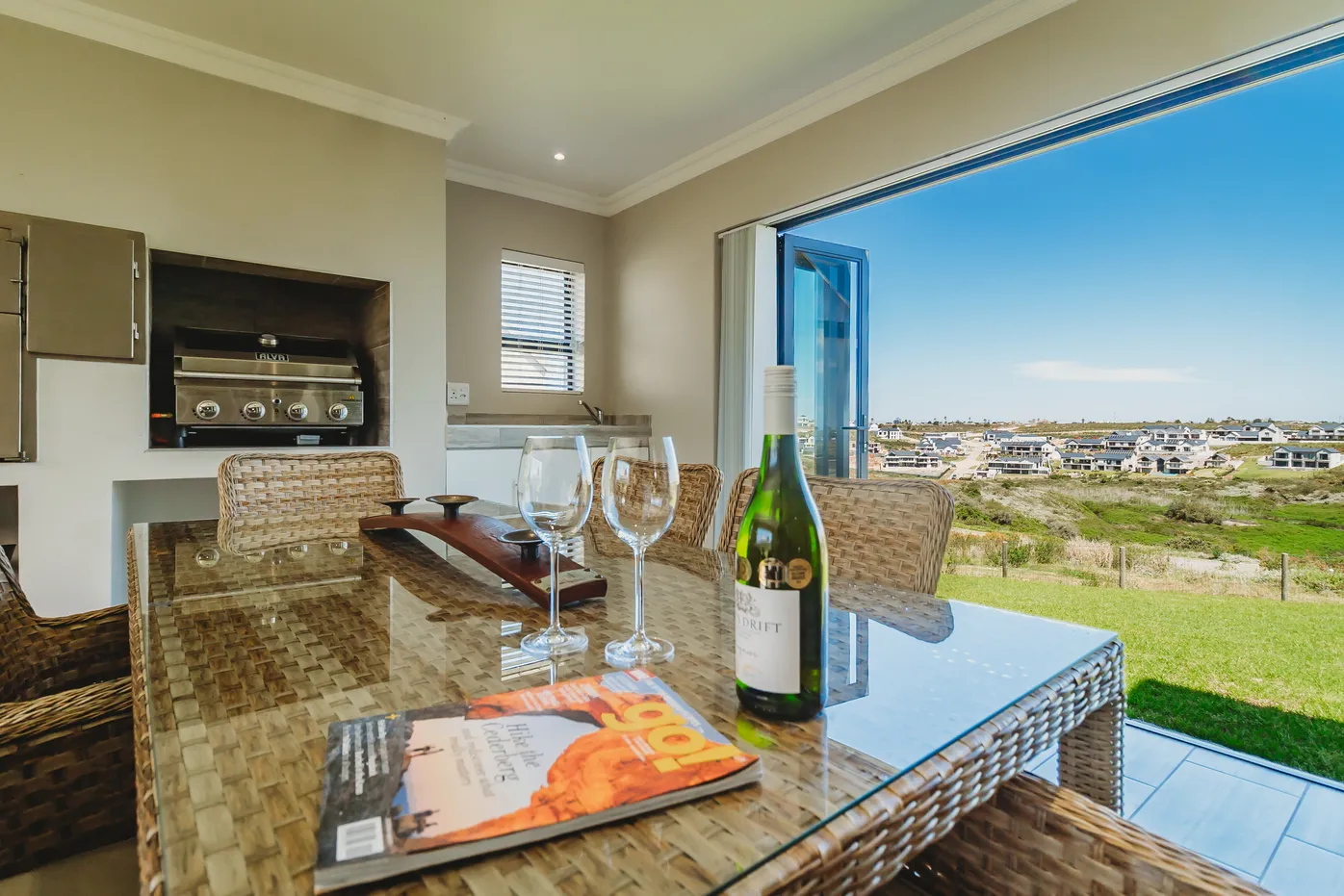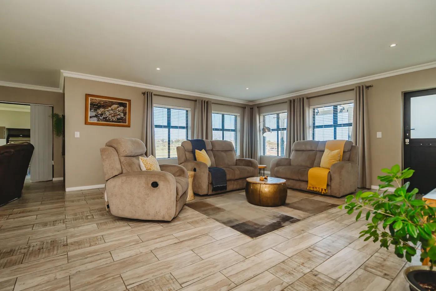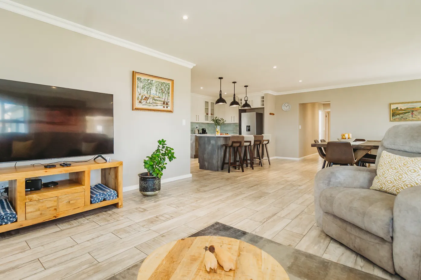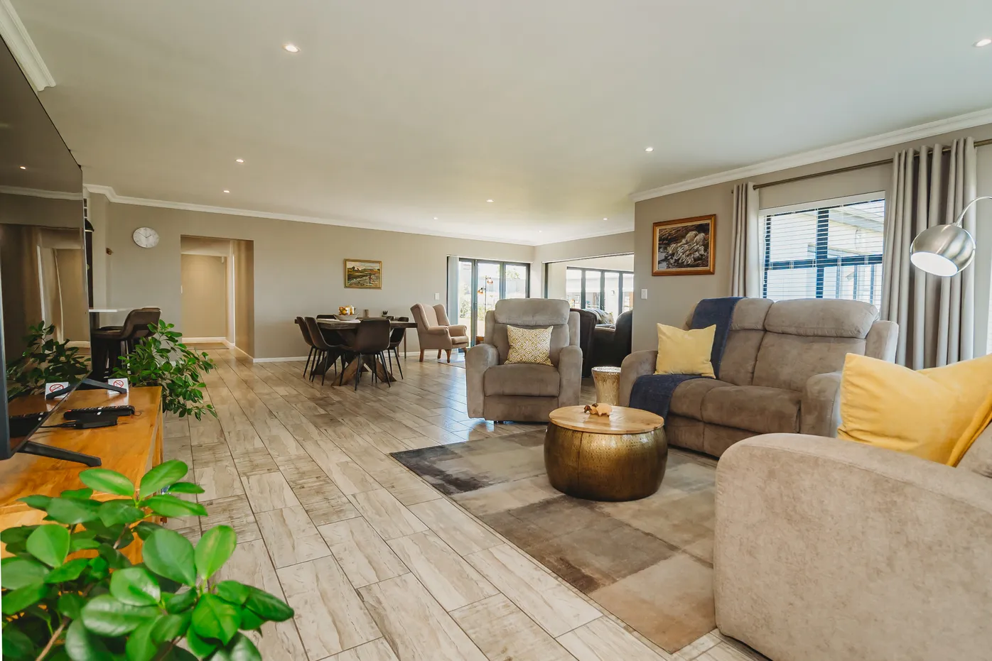 Contemporary villa with pool, 75" TV, and expansive fairway views.